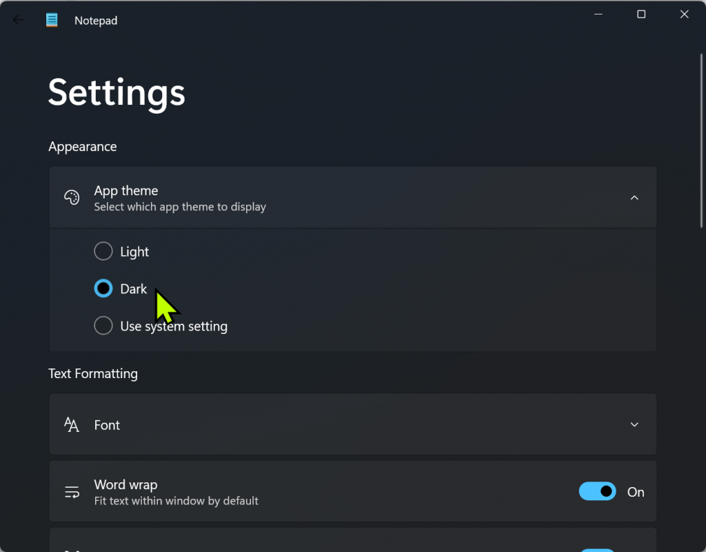 ✅ To force Notepad into dark mode regardless of Windows settings, simply select Dark.